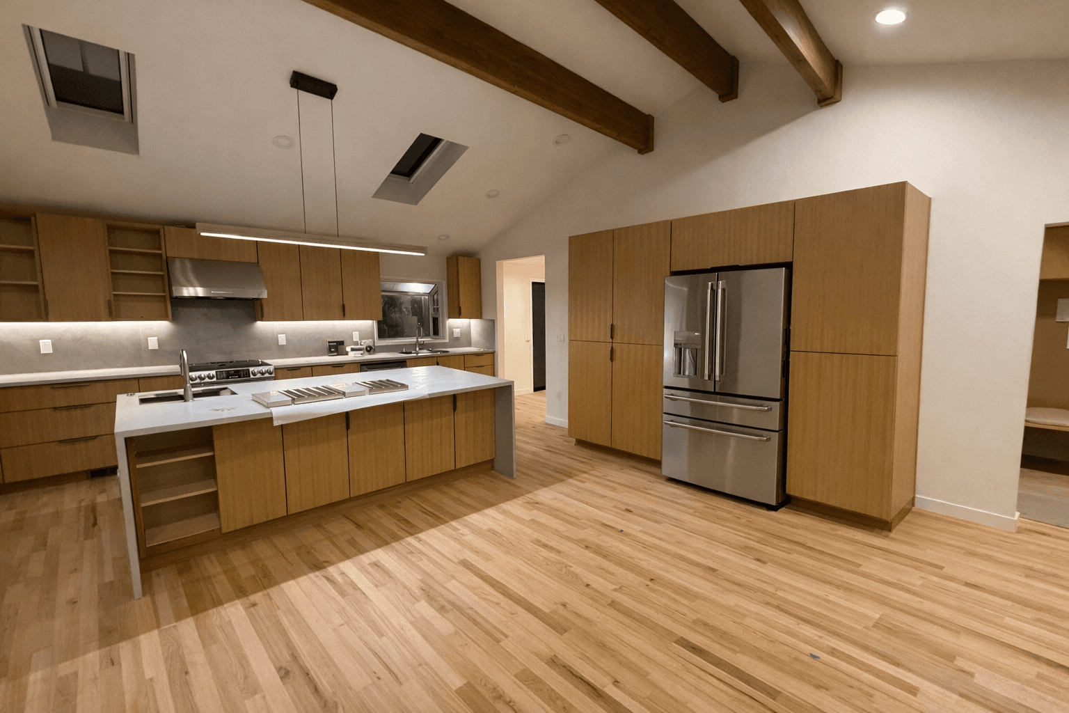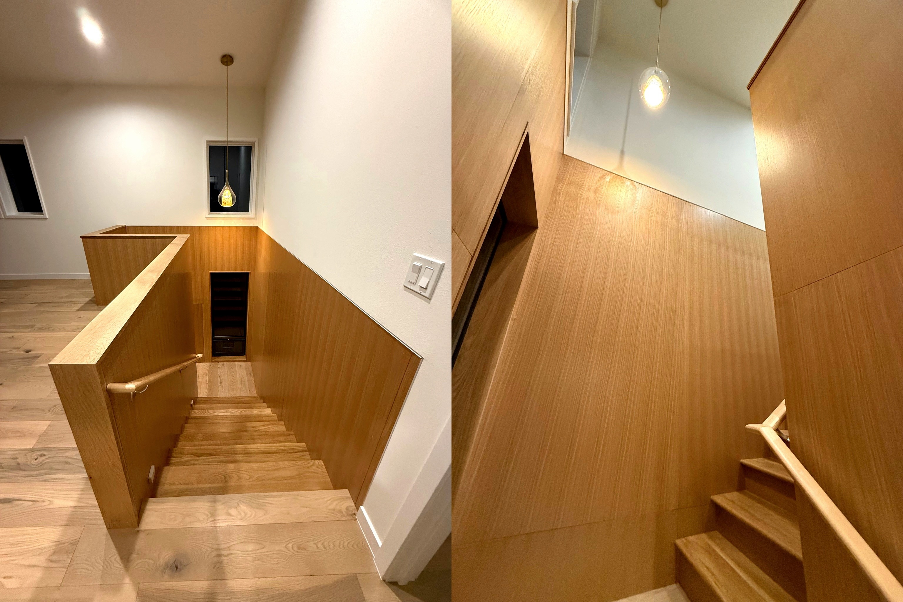 Working closely with the homeowner and contractor, the design process extended from kitchen sourcing and material comparisons to lighting selection and construction detailing. From the jointing of oak panels to the transitions between drywall and millwork, every element was considered with precision.